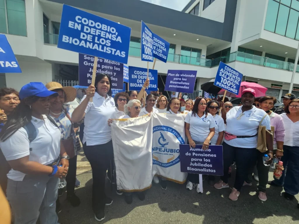 Santo Domingo, RD – Decenas de bioanalistas pensionados se manifestaron hoy frente a la Dirección General de Jubilaciones y Pensiones (DGJP) en Santo Domingo, exigiendo mejoras urgentes en sus condiciones salariales y acceso a un seguro médico adecuado. Con pancartas en mano, los manifestantes expresaron su frustración con el grito: «Esta lucha va a llegar al Palacio Nacional, 30 años trabajando y la vejez mendigando».