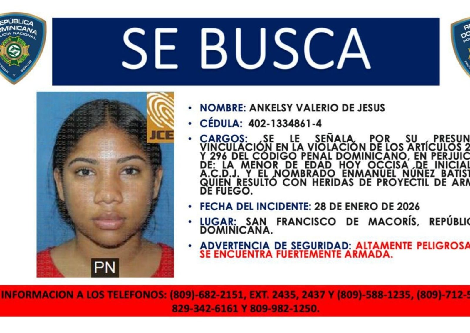 Las autoridades indicaron que continúan las indagatorias para esclarecer las circunstancias del hecho y reiteraron el llamado a Akeisy Valerio de Jesús para que se entregue por la vía correspondiente.