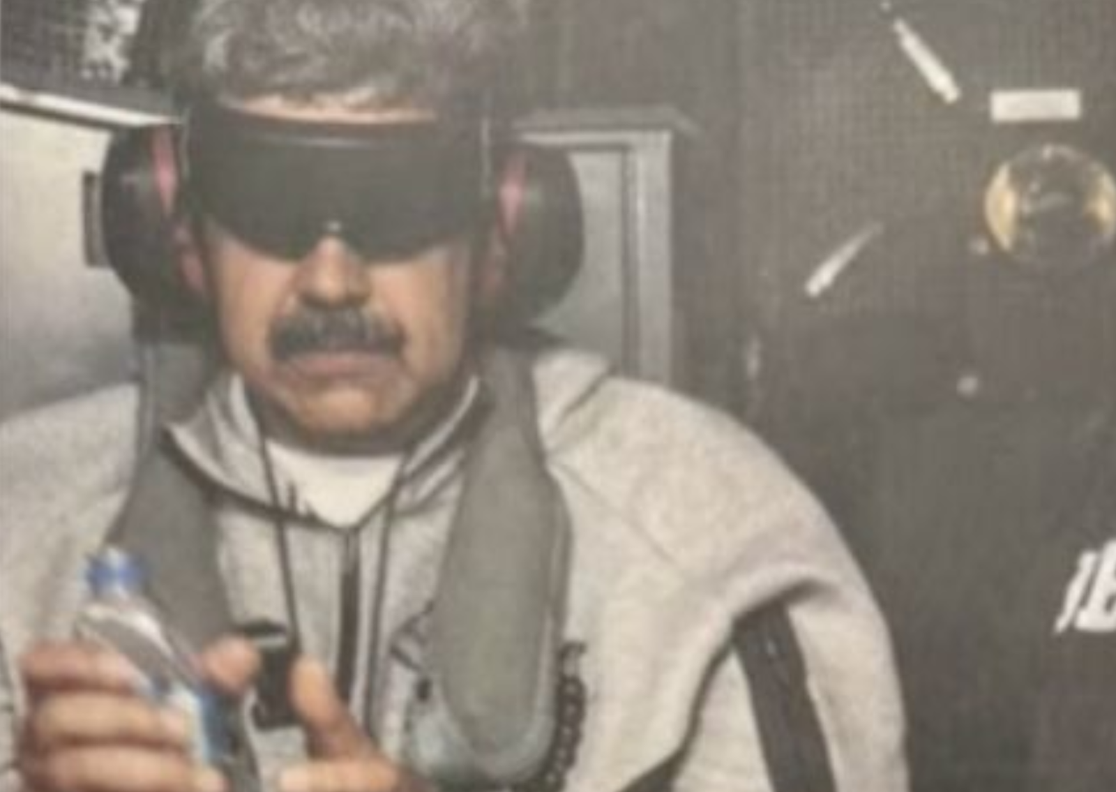 En la imagen publicada por Trump se observa al dictador venezolano vestido con ropas deportivas, unas grandes anteojeras negras, y una pequeña botella de agua mineral en sus manos. Esposado, lleva puestos unos grandes auriculares.