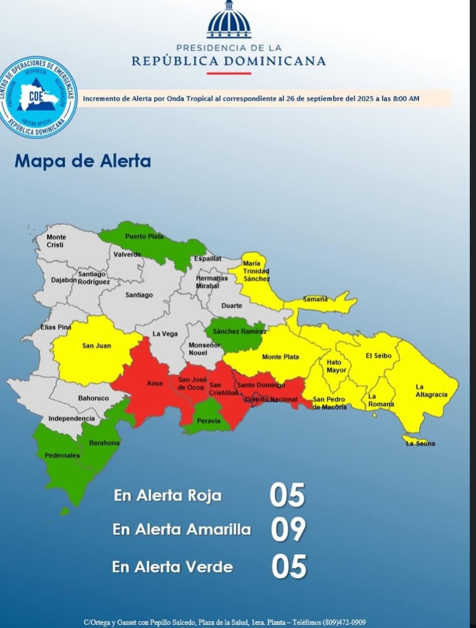 Las provincias colocadas en alerta roja son Santo Domingo, Distrito Nacional, San Cristóbal, San José de Ocoa y Azua. Mientras que en alerta amarilla se encuentran María Trinidad Sánchez, San Pedro de Macorís, El Seibo, San Juan, Monte Plata, La Altagracia, Samaná y Hato Mayor. En verde quedan Barahona, Peravia, Puerto Plata, Pedernales y Sánchez Ramírez.