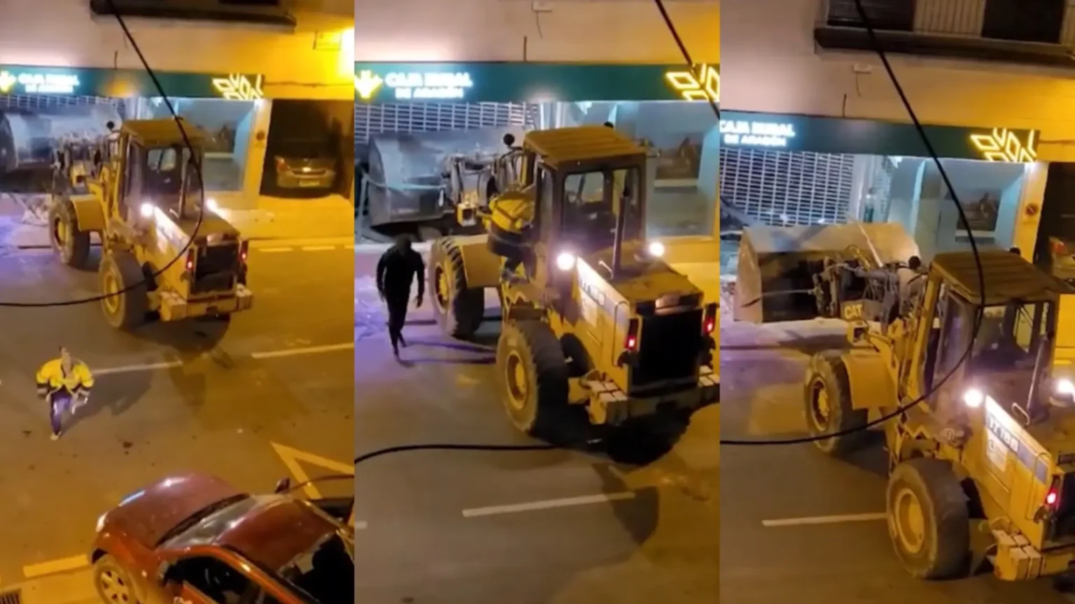 Tres encapuchados intentaron robar con una pala excavadora una sucursal del banco Caja Rural en un barrio de Zaragoza (España). El atraco frustrado, que quedó grabado en video, tuvo lugar la madrugada del jueves.