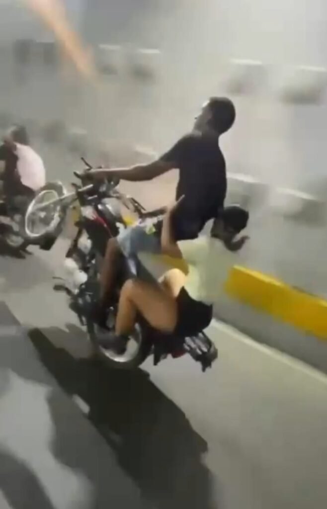 Un video impactante ha llegado a la redacción de nuestro medio, cortesía de Diario Gascue (DG), mostrando una escena que ha encendido las alarmas sobre la imprudencia vial en la capital dominicana. Las imágenes, captadas en el desnivel de la avenida 27 de Febrero, revelan a un joven conductor de motocicleta realizando una peligrosa acrobacia conocida como “calibrando” o “wheelie”, es decir, circulando en una sola rueda. Lo más alarmante es que no está solo, lo acompaña una fémina, aparentemente de la misma edad, lo que duplica el riesgo inherente a esta temeraria acción.