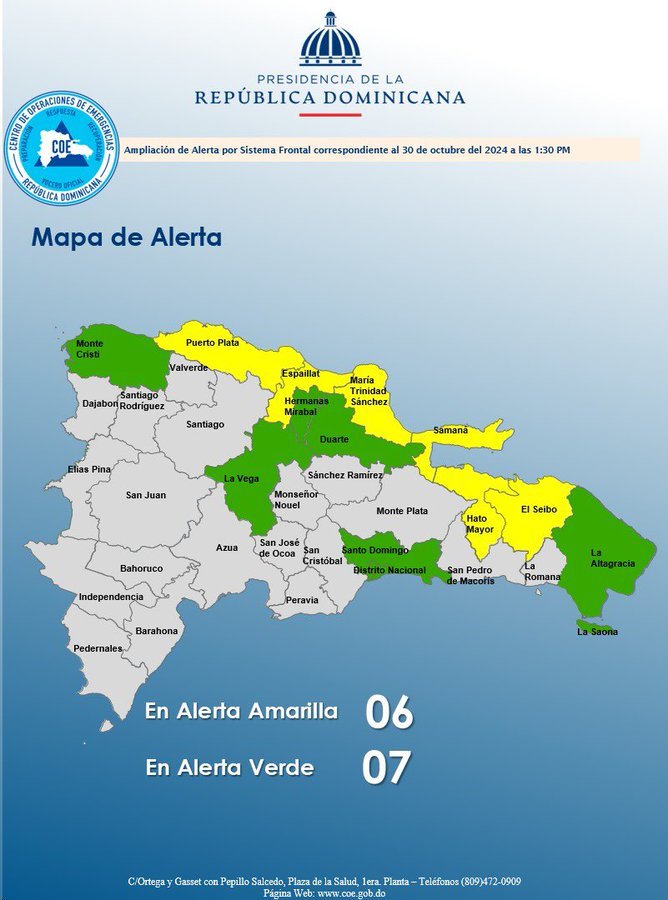Santo Domingo, RD. -El Centro de Operaciones de Emergencia (COE) aumentó a siete las provincias en alerta verde y mantiene en seis las que están en amarilla, debido a la incidencia de un sistema frontal en las condiciones del tiempo del país.