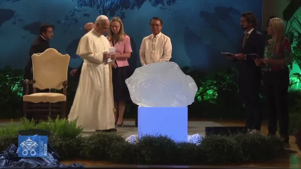El evento, que combinó el simbolismo religioso con el activismo ambiental, tuvo como protagonista un bloque de hielo de más de 20,000 años de antigüedad, que fue trasladado directamente desde Groenlandia hasta el lugar de la conferencia.