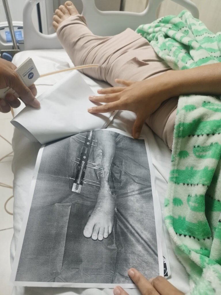 “Yo tuve ocho fracturas y los huesos salieron al exterior, entonces tengo una herida que está todavía muy expuesta, todavía se ve el hueso y se ven los tendones, entonces ellos lo que me dicen es que están esperando que el músculo suba para luego hacerme un injerto. No lo han hecho el injerto porque todavía se ve el hueso, pero realmente la máquina me ha ayudado mucho; para el tiempo ha cicatrizado muy bien, ha subido muy bien”, agregó.