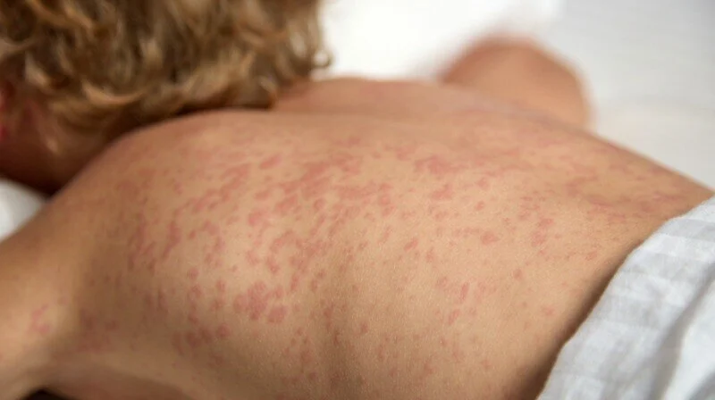 Se manifiesta por multitud de manchas pequeñas y rojas y que va precedida y acompañada de lagrimeo, estornudo, tos y otros síntomas catarrales.